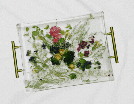 Showcase your most cherished flowers in a stunning, functional resin tray—perfect for preserving memories with elegance and purpose. Handcrafted from your special blooms and cast in crystal-clear, professional-grade resin, this 11x14" tray features sleek gold side handles for a touch of luxury and ease of use. Whether styled as a centerpiece or used daily, it’s a meaningful way to keep your flowers close and beautifully displayed.