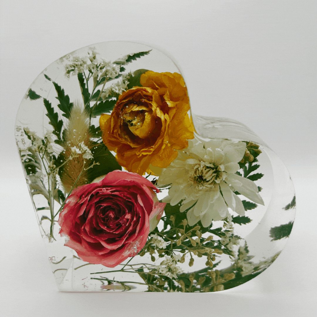 Celebrate your most cherished memories with a beautifully crafted heart-shaped resin block—made to last a lifetime. Whether from a wedding, memorial, or other meaningful event, each piece is thoughtfully designed to showcase your flowers in a romantic, heartfelt silhouette. Expertly arranged and preserved in crystal-clear, professional-grade resin, this timeless keepsake turns your bouquet into a treasured display you’ll love for years to come.