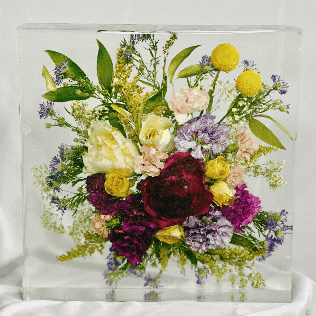 Preserve your most cherished flowers in a stunning square resin block—crafted to last a lifetime. Whether from a wedding, memorial, or another special occasion, each piece is custom-made to highlight your blooms in a sleek, timeless design. Hand-arranged and cast in crystal-clear, professional-grade resin, this modern keepsake turns your bouquet into a lasting work of art you can hold, display, and treasure for years to come.
